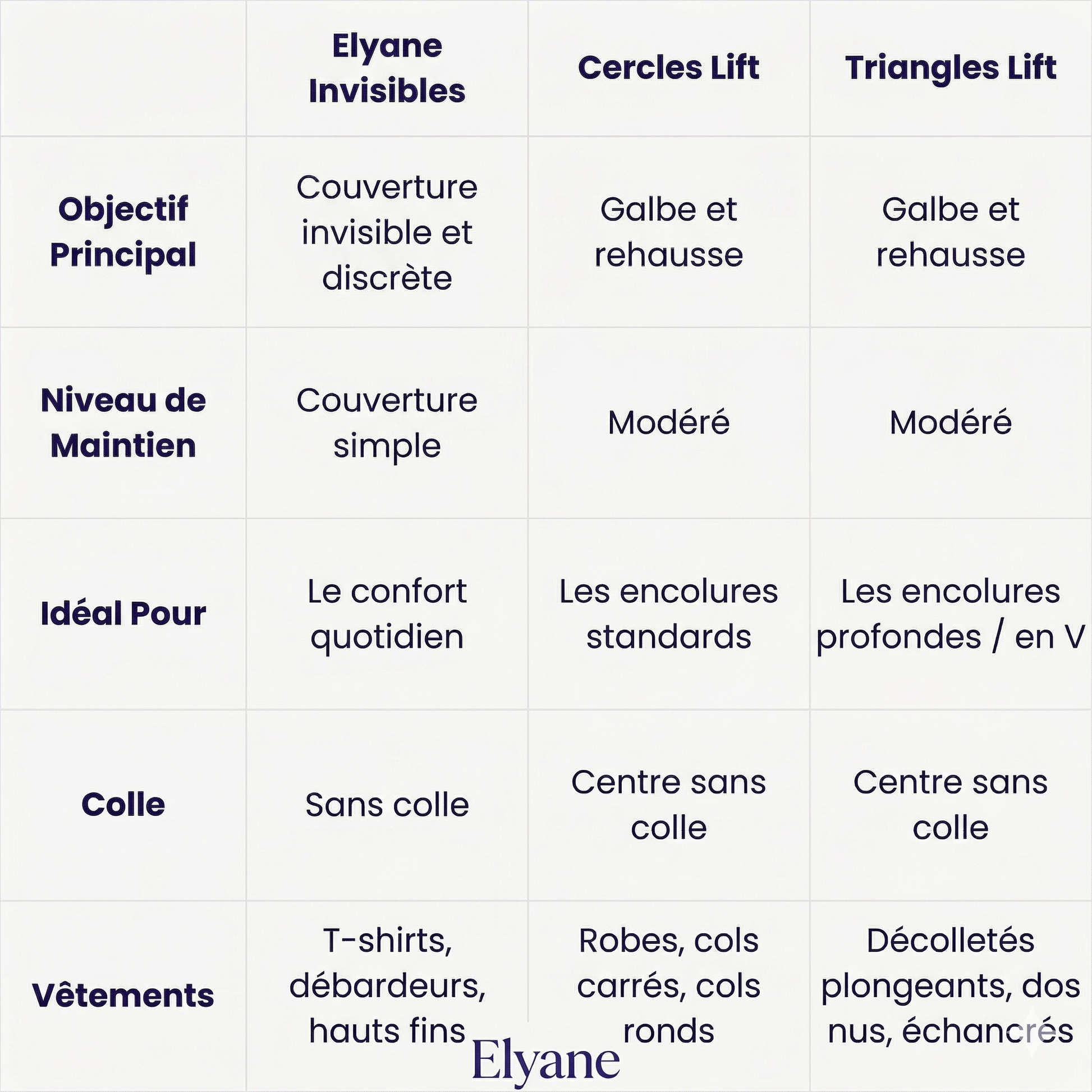 Nos produits existent en plusieurs teintes et styles car la vraie beauté n’est pas unique. Que vous portiez Elyane™ pour vous sentir libre sous votre robe préférée, ou pour abandonner complètement le soutien-gorge, nous sommes là pour célébrer votre version de la confiance.